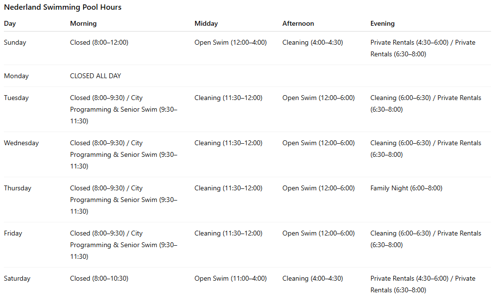 For any other inquiries, contact the Nederland Recreation Center.